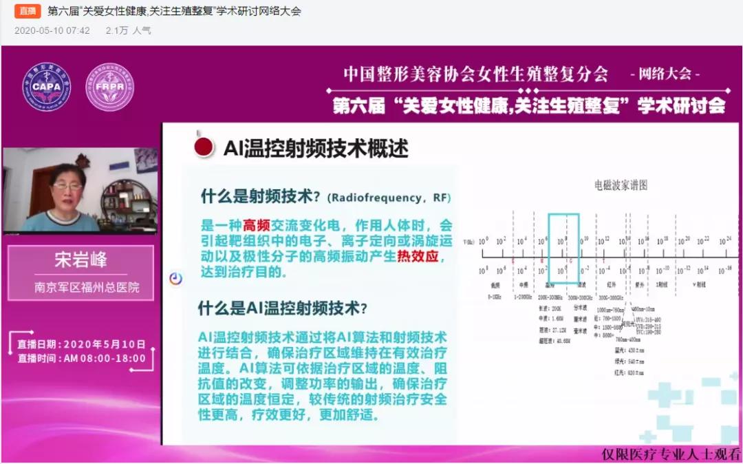 南京軍區(qū)福州總醫(yī)院宋巖峰教授首先對AI溫控射頻技術(shù)治療疾病的工作原理和特點(diǎn)給予具體講解,然后指出該技術(shù)可應(yīng)用于壓力性尿失禁、痛經(jīng)、腰背痛、頑固性霉菌性陰道炎、子宮脫垂、陰道干澀疼痛、性功能障礙、慢性盆腔痛、陰道松弛、萎縮性陰道炎等多種盆底功能障礙性疾病。同時(shí),宋教授還引用多篇研究文獻(xiàn)介紹了AI溫控射頻技術(shù)在女性盆底功能障礙性疾病應(yīng)用中的臨床療效。