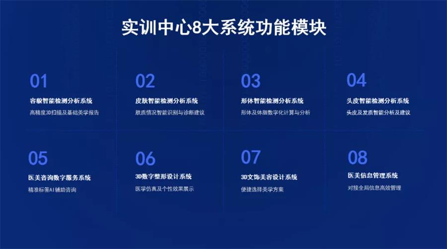 據(jù)田亞華介紹,全國高校數(shù)字化醫(yī)療美容實訓(xùn)中心共有8大系統(tǒng)功能模塊,分別為容貌智能檢測分析系統(tǒng)、皮膚智能檢測分析系統(tǒng)、形體智能檢測分析系統(tǒng)、頭皮智能檢測分析系統(tǒng)、醫(yī)美咨詢數(shù)字服務(wù)系統(tǒng)、3D數(shù)字整形設(shè)計系統(tǒng)、3D文飾美容設(shè)計系統(tǒng)、醫(yī)美信息管理系統(tǒng)。